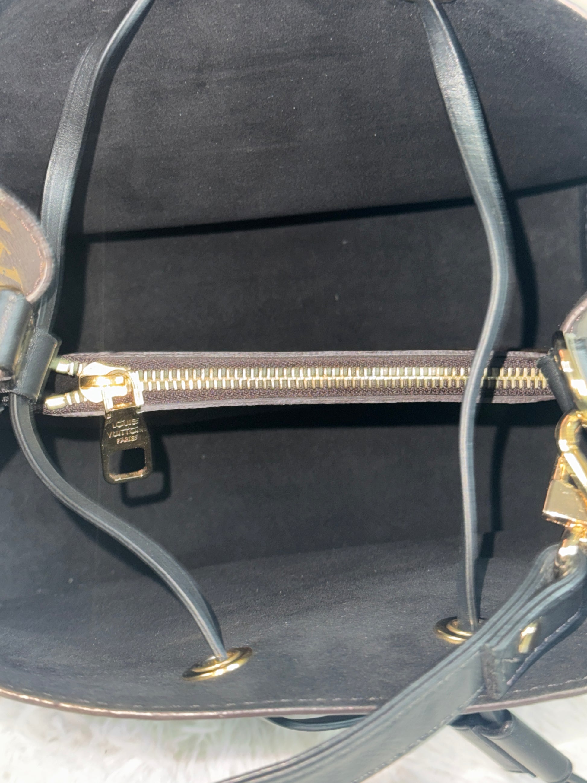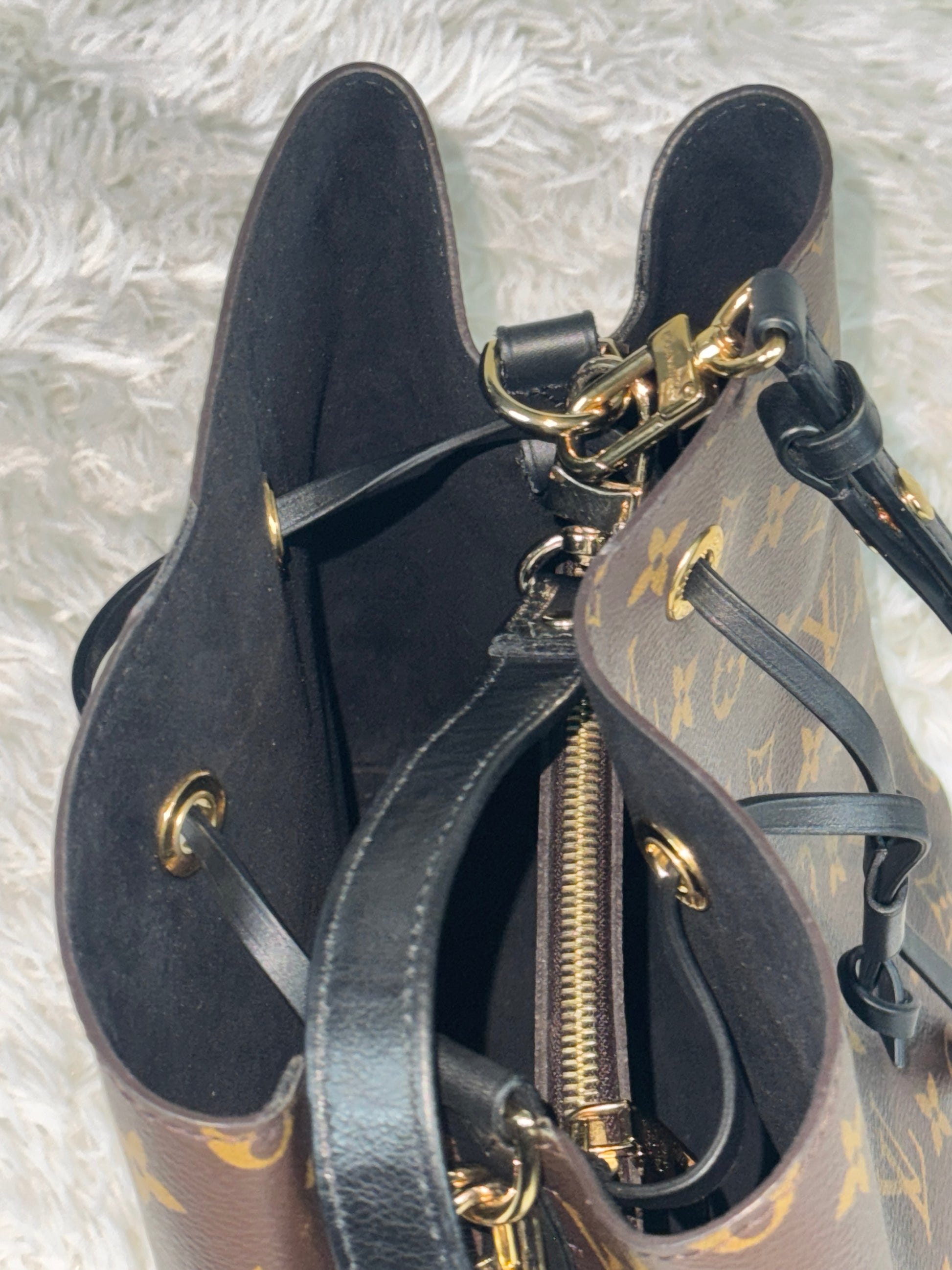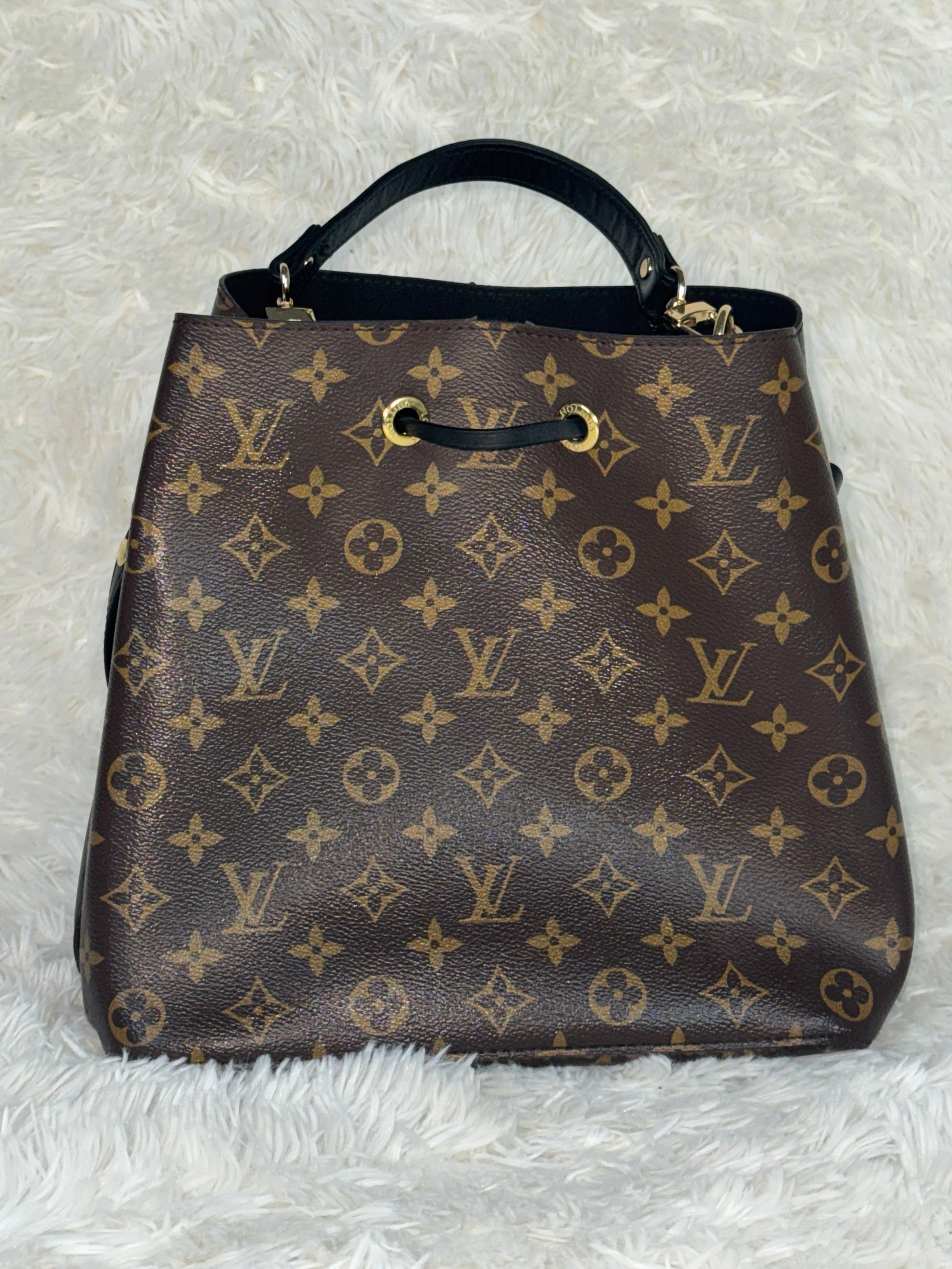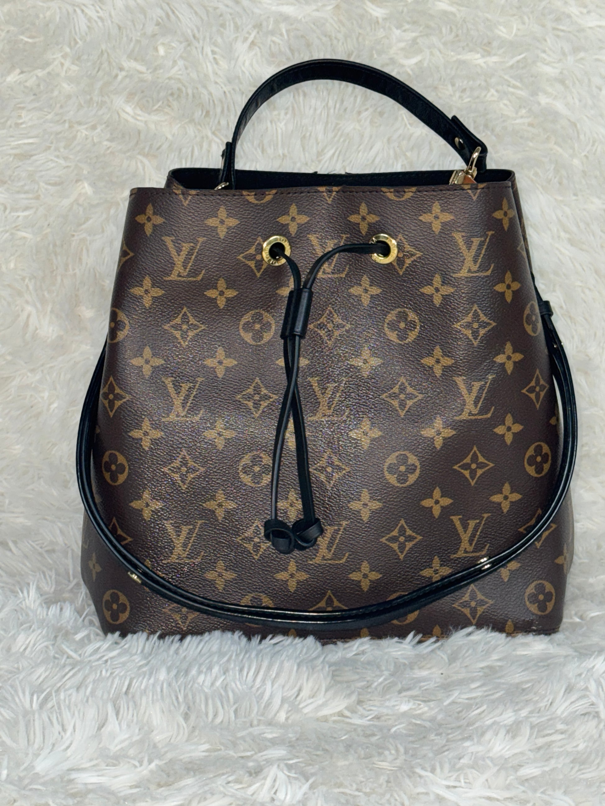 The Louis Vuitton Black Monogram Neonoe MM is a medium-sized shoulder bag with a drawstring closure and a detachable shoulder strap in black leather. It features the iconic Louis Vuitton monogram pattern on canvas and leather, with gold-plated hardware accents. The bag has adjustable straps and a strap accent, making it a stylish and versatile accessory for women. Handmade in the USA, this designer bag exudes luxury and sophistication in every detail.